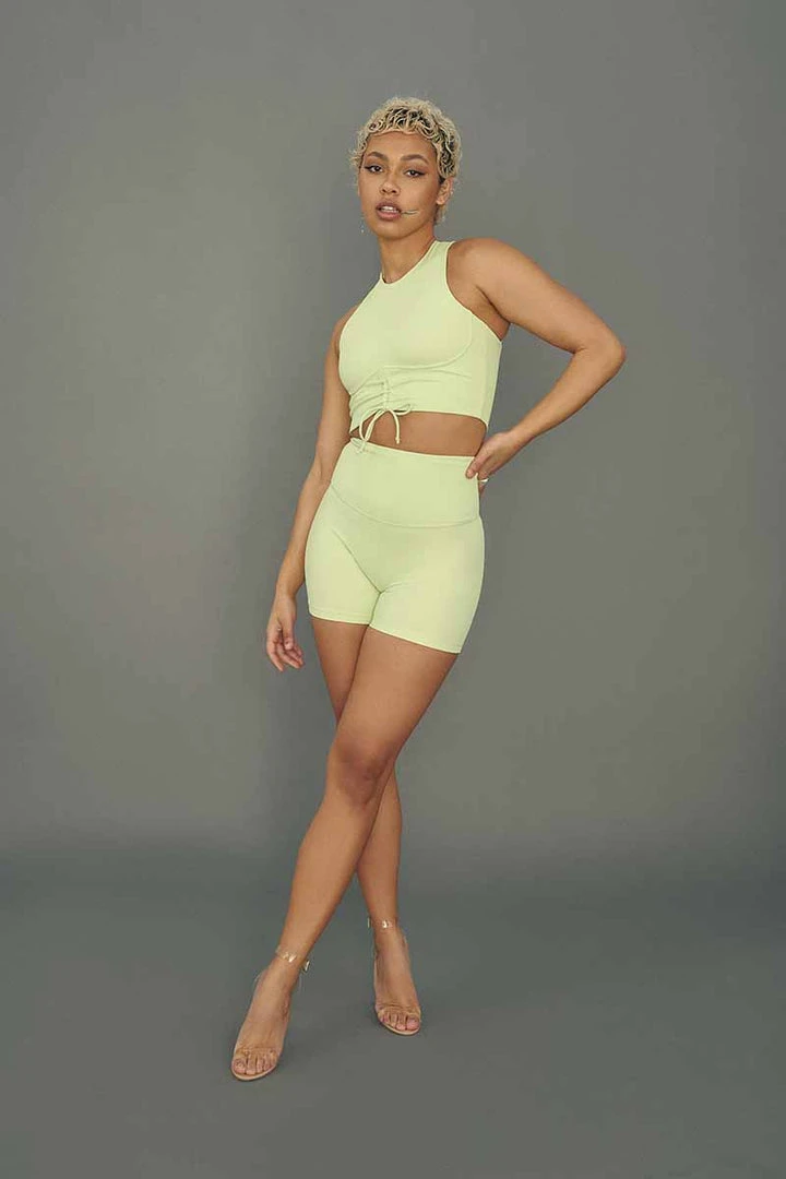 Move It Ribbed Corset Crop with ruche tie front detailing.