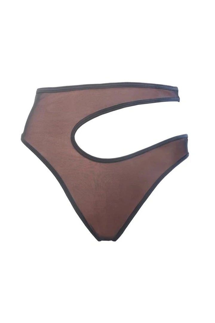 Get ready to turn heads in this iconic asymmetric black mesh set. High leg shorts with cut out section on one hip.ย The nude underlay gives the illusion of nudity without needing to bare all.