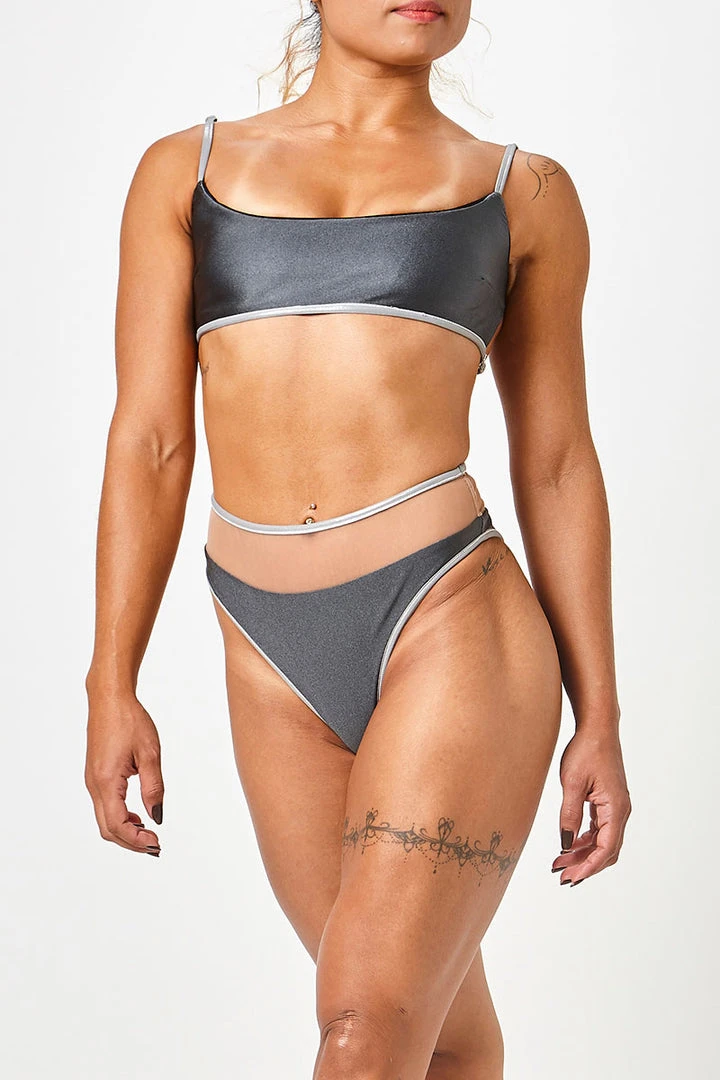 This shimmery set is out of this world. This scoop neck top can be worn black or Space Grey so you can change up our look. We love the silver piping details and strappy back.